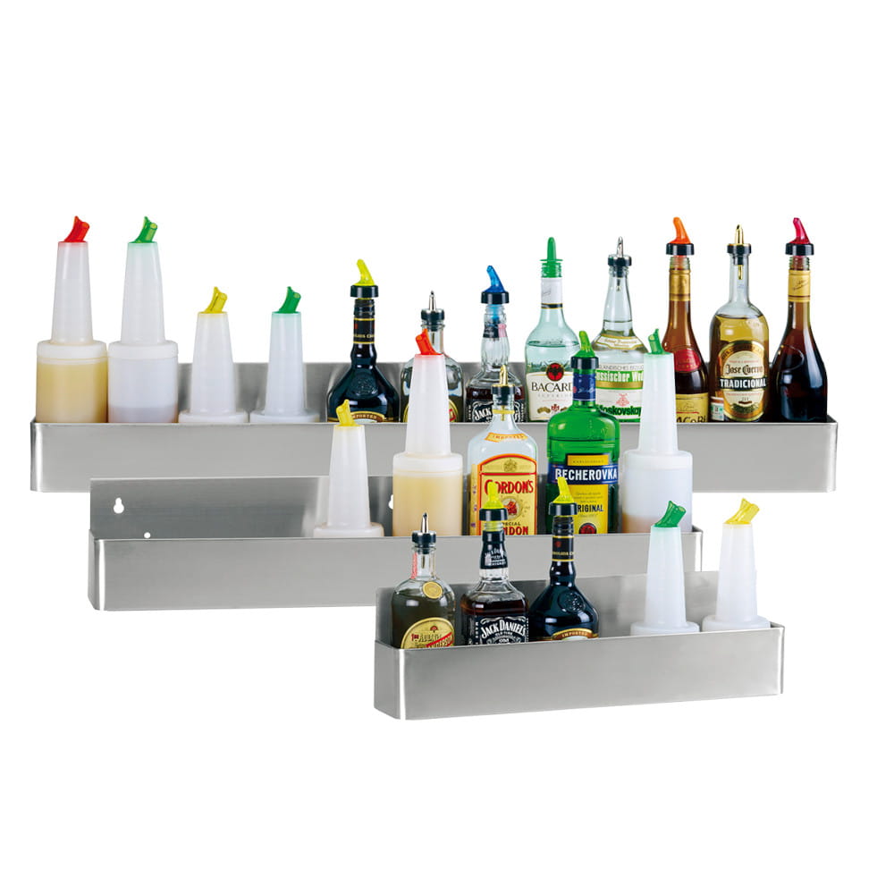W tylnej części znajdują się otwory do zawieszenia rynny. Dzieki temu mozesz zawiesic polke w kazdym dowolnym miejscu za barem. Całość jest wykonana ze stali nierdzewnej. Półka pomieści większość standardowych butelek z alkoholem, syropem lub także dyspenser z sokiem.